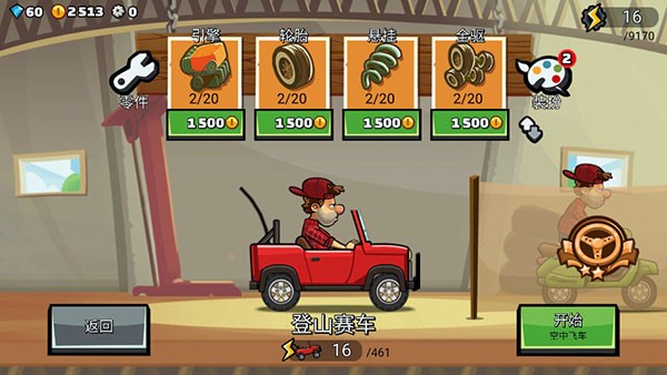 可在赛车系统中升级装备:引擎提升加速性能,轮胎增强抓地力,跳跃部件优化减震,提升行驶稳定性。